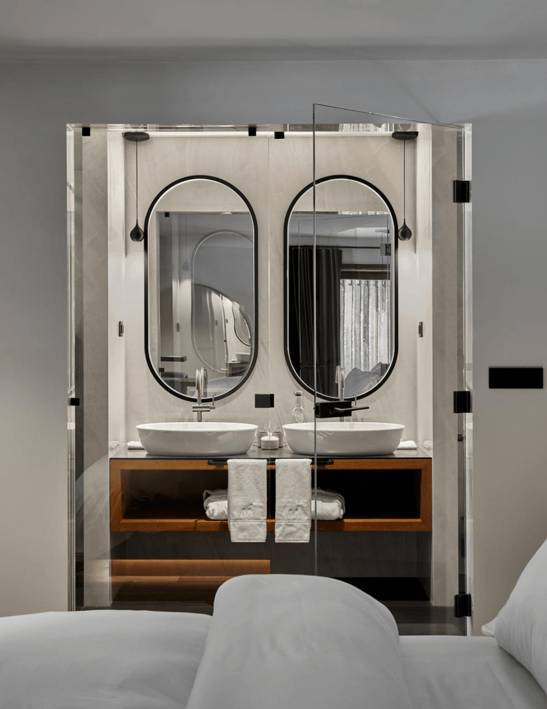 - Ogledala in ogledalne omare: z možnostjo integrirane osvetlitve in skritim shranjevalnim prostorom